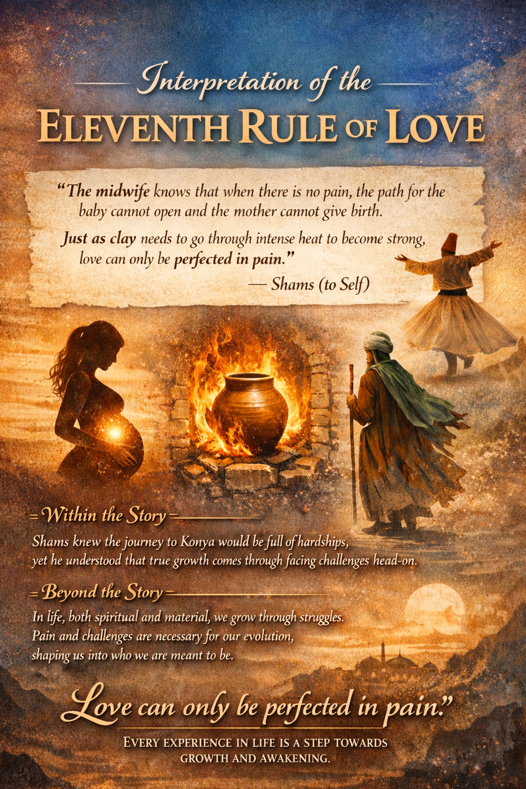Rule Number 11 — The midwife knows that when there is no pain, the way for the baby cannot be opened and the mother cannot give birth. Likewise, for a new self to be born, hardship is necessary. Just as clay needs to go through intense heat to become strong, Love can only be perfected in pain.